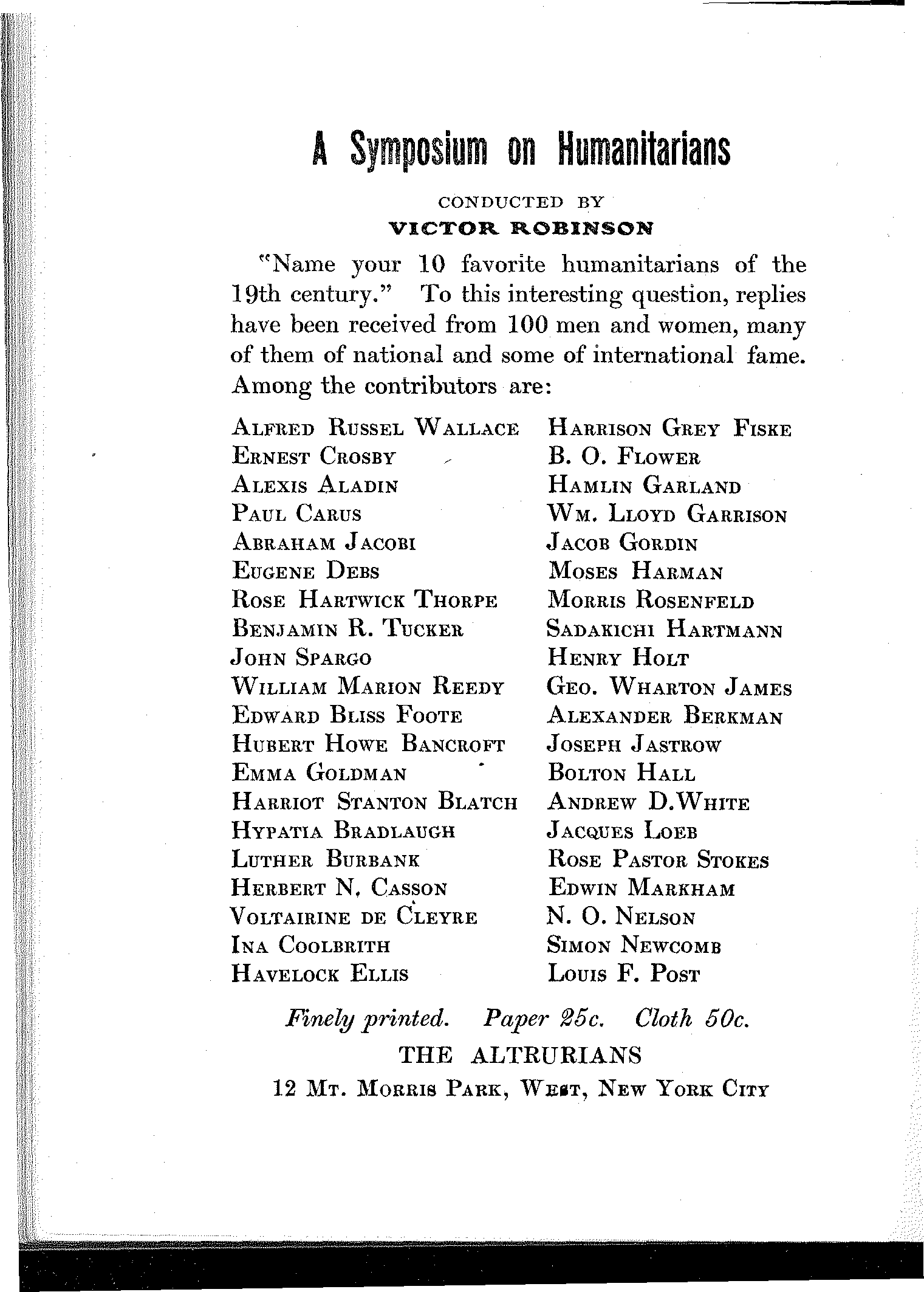 "Name your 10 favorite humanitarians of the 19th century." To this interesting question, replies have been received from 100 men and women, many of them of national and some of international fame. Among the contributors are: