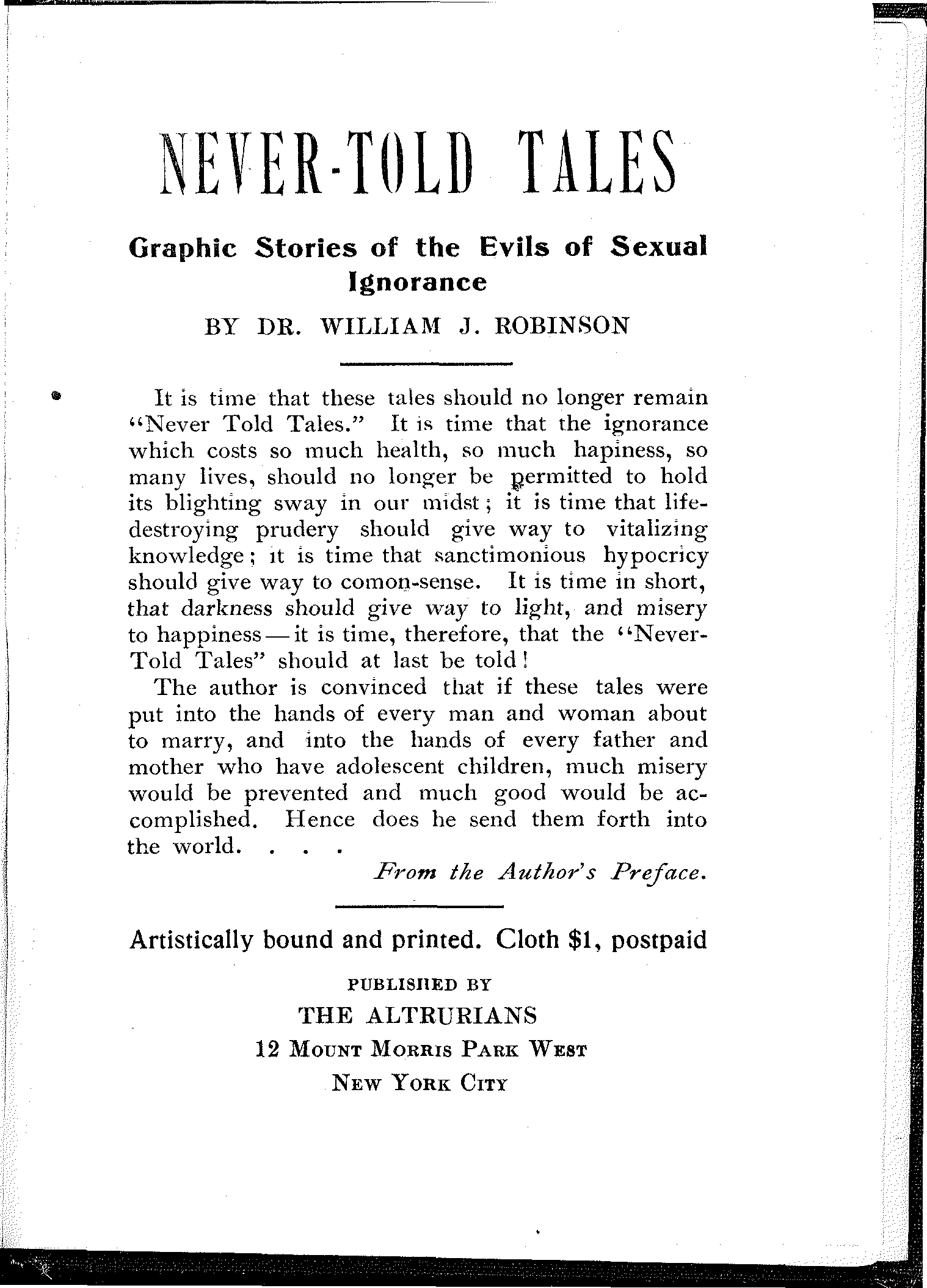It is time that these tales should no longer remain "Never Told Tales." It is time that the ignorance which costs so much health, so much happiness, so many lives, should no longer be permitted to hold its blighting sway in our midst; it is time that life-destroying prudery should give way to vitalizing knowledge; it is time that sanctimonious hypocracy should give way to common-sense. It is time in short, that darkness should give way to light, and misery to happiness—it is time, therefore, that the "Never-Told Tales" should at last be told!