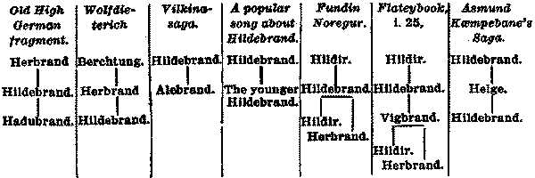[31] In nearly all the names of members of this family, Hild- or -brand, appears as a part of the compound word. All that the names appear to signify is that their owners belong to the Hilding race. Examples:—