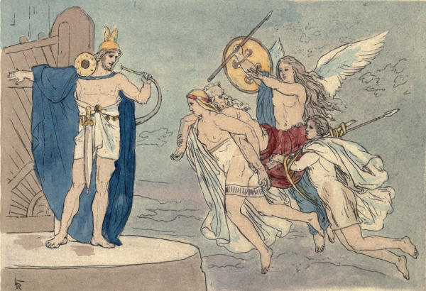 Heimdal, the god of light, father of men, sire of kings, was warder of the gates of Valhalla and lived in a castle at the end of the rainbow (Bifröst bridge). He possessed a trumpet called Gjallarhorn with which he summoned together the gods at Ragnarok. He is represented as the zealous gate-keeper who received and admitted to Valhalla the bodies of warriors slain in battle, when brought hence by Valkyrie maidens who gathered them from battle-fields. Valhalla was the abode of Odin in Asgard which was situated in Gladsheim, the valley of joy. In this paradise dead warriors were revived and spent all after-time fighting, feasting, and drinking as the guests of Odin, pursuing those pleasures that most delighted them when in the flesh.