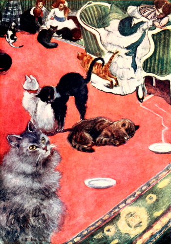 It was the great advantage of mother's being a pet cat that she and her family lived in the house, not in a cattery, as they are called. Mother knew very well what a cattery was like—she had been in one before a man bought her and gave her to Auntie May as a present. She cost three guineas, she said. It was a very nice cattery, as catteries go—she admits that—and she will always look upon it with affection as being her first home, but still there was a lot of difference between it and Auntie May's house. A cattery has generally hard trodden-in earth for a floor, without a carpet, except for a few unhemmed bits spread here and there. There's generally an old chair—wooden—to scrape your claws on: now velvet, such as is kept here, mother says, is much more interesting and efficacious. The bed is inside, under cover—I grant you that—but only made out of a few old packing cases, and there is generally a horrid smelly oil-lamp to warm the whole place. Now Auntie May had us in her own bedroom for the first week of our lives, and when she did move us, it was only into her study. She was an authoress and had to have a study; at least her father, who was a distinguished painter and R.A., and adores his daughter, thought she had as much right as he to have a studio—same word as study. 'She sells her books, and I don't sell my pictures!' he said. (I call her Auntie May because Rosamond does, and because it sounds more respectful, and mother said I ought.) Her study was quite nicely furnished and full of bureaus and manuscript cupboards and high things to perch on. Mother says it is advisable when choosing a perch to get as high as possible, because of the draughts that run along the floors of even the best rooms.