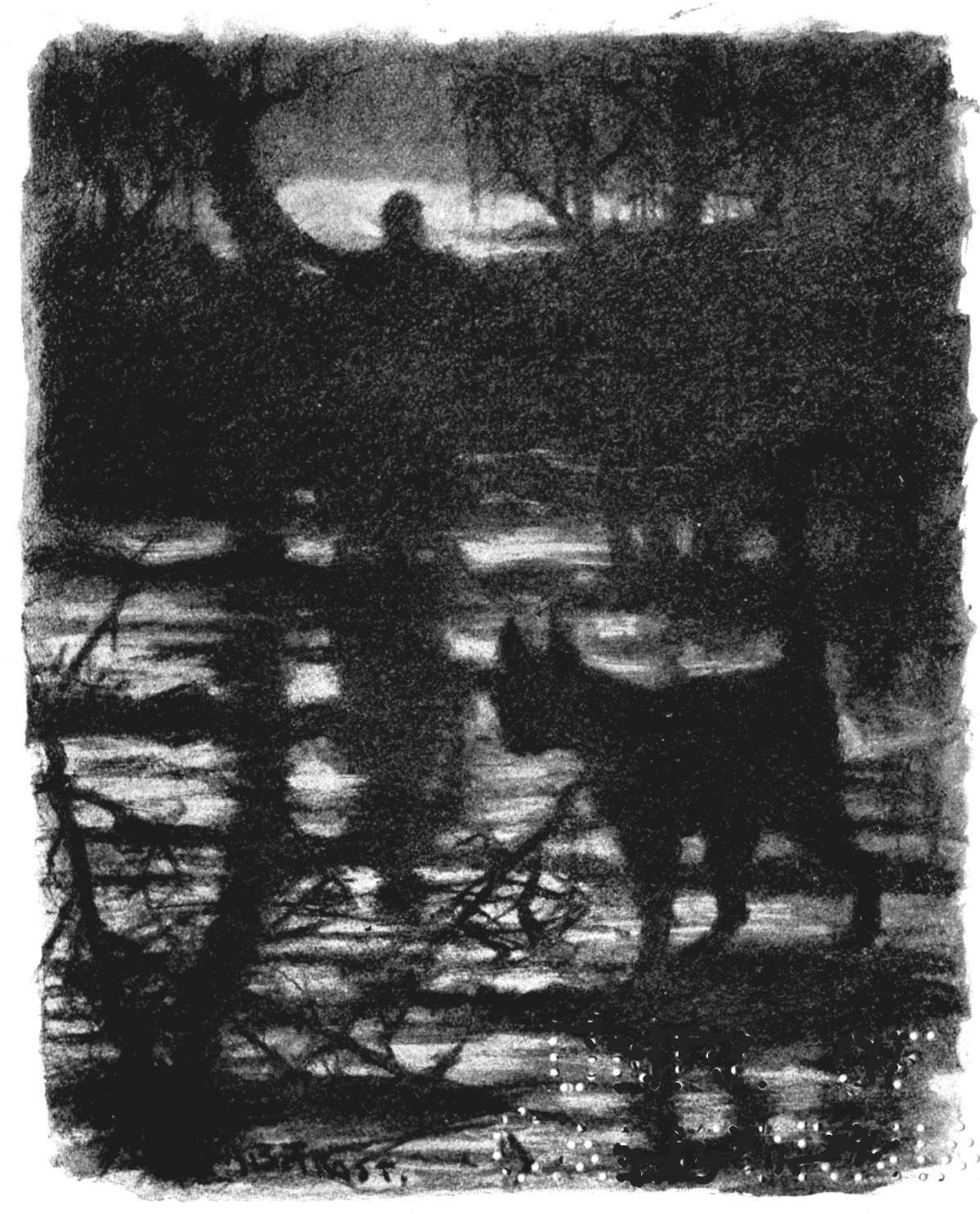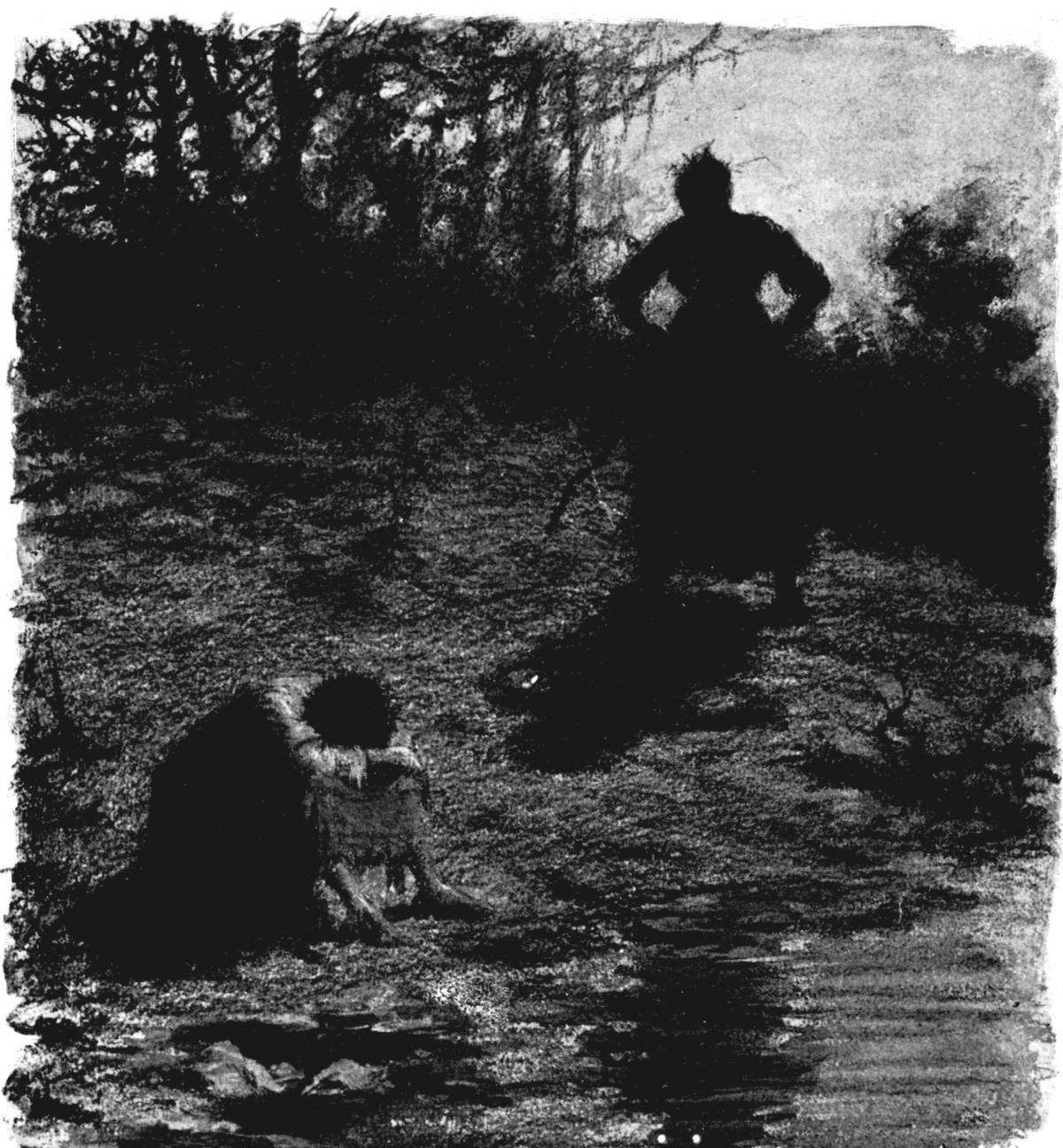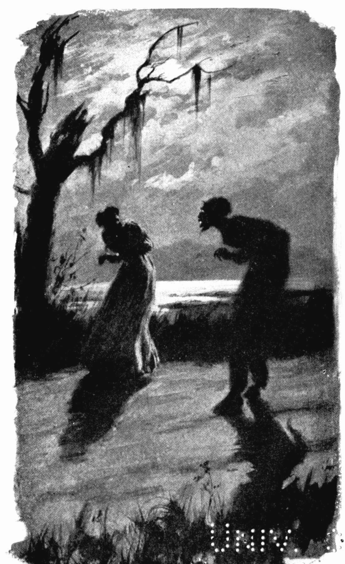 The new moon, said Mammy, was nearly born, and the devil’s time on earth was short. Again he sat by the sluggish water of the bayou and stirred it with a stick, and out of it came the moccasins, the eels, and the toads to do his bidding. He whistled low, and from the[Pg 209] trees the bat, the owl, the jay-bird, and the crow answered the call of their master; and there, in his heart, the devil envied Unc’ Caspar and wanted ’Liza.
