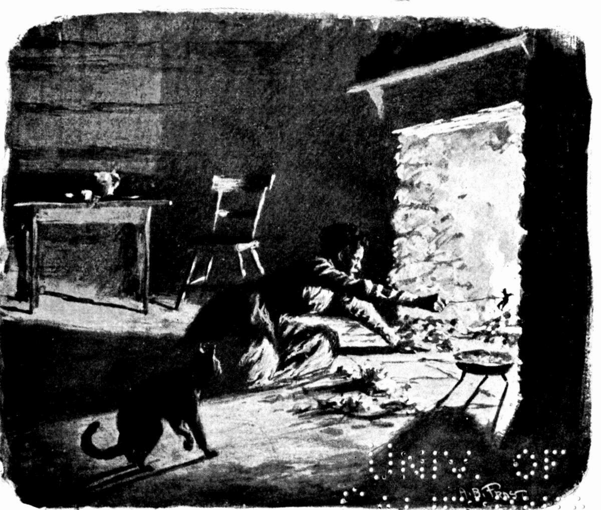 “Dey all stan’ an’ wait, des er hol’in’ dey brefs ter see what gwine happin, an’ bimeby de blaze hit die an’ de smoke cl’ar ’way, an’ dar wa’n’t nuffin lef’ but er little pile er ashes, an’ de niggers falls ter whisperin’, ercusin’ Unc’ Cæsar fur burnin’ up po’ sick ’Lish’s cabin an’ his kivers; when Unc’ Cæsar he p’int one long arm wid er long, shakin’ finger, an’ say: ’Look!’—an’, bless goodness! right dar in de middle er de pile er hot ashes dat des still er-smould’rin’, sot de berry same ole black cat, des er-grinnin’ fitten ter bust.