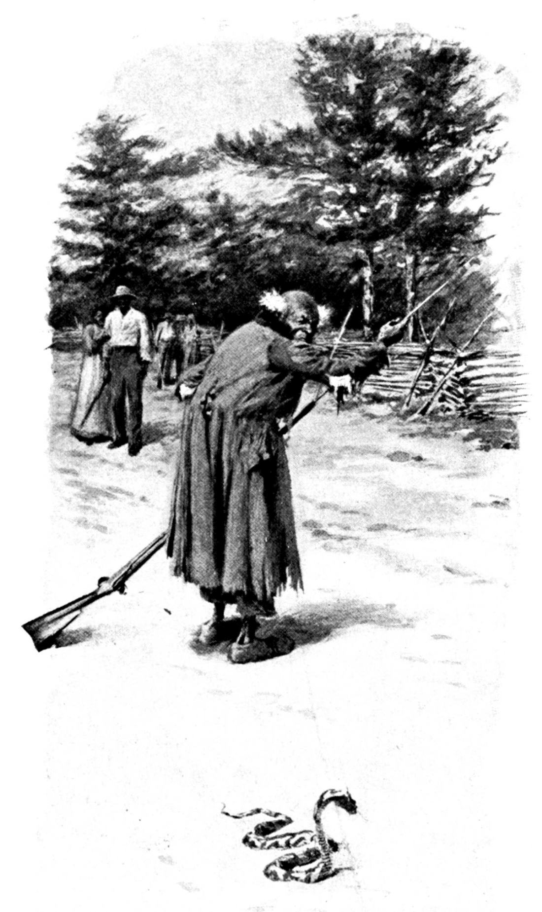A very thoughtful, silent pair joined the hands in the field that morning, for everything seemed to be going wrong. Juno got a “miz’ry in her side” long before noon, and just as the most unsatisfactory day that they had ever spent together was closing, a “cotton-mouth” bit Solon on the heel. Juno ran to kill a chicken to apply to the wound to draw out the poison, for she had more faith in the warm chicken than in Ole Marse’s whiskey, which was plentifully supplied. She did not want to see Solon die with, as she said, “a lie in de mouf”; and, hoping to avert evil, she killed the very rooster that had crowed so inauspiciously early in the morning, thus opening upon her head the vials of Solon’s wrath when he had recovered from his fright.