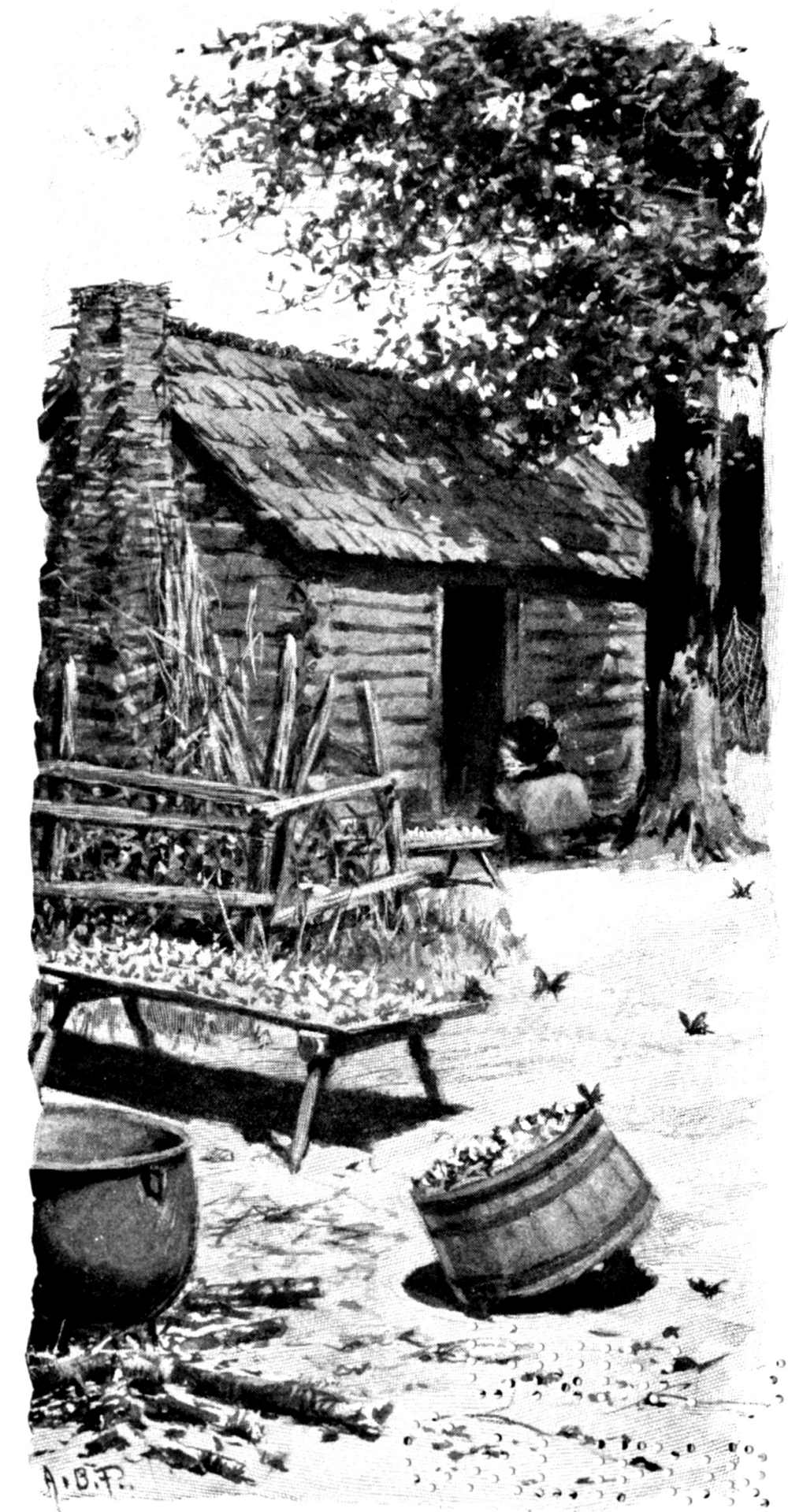 But “Baby” is wearing trousers now—has attained to the dignity of being called by his own name, and “Mammy” is back in her cabin again, that Mecca of childish desire, between which and the “Big House” a path is worn by little pilgrims; for if “Mammy” is ailing there are flannels and loaf-sugar to be brought, and there are always ash-cakes to be baked, sweet-potatoes, goobers, chestnuts, or apples to be roasted by “Mammy’s” hearth, and, if nothing else offers, even plain buttermilk off her deal table, drunk from her cracked blue china bowl, tastes better than any other.