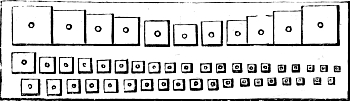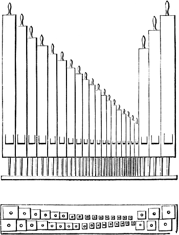 Our task will be somewhat simplified if we suppose that an organ is desired for a room of moderate size. Such an instrument will commonly have one manual, or row of keys, with four or five stops, or sets of pipes. Pedals, with or without pipes of their own of deep bass quality, must be considered essential in every organ making any pretension to completeness, or intended to afford useful practice for learners. Taking this as a rough outline or sketch of probable plans, it will be easy to see hereafter how they may be indefinitely extended.