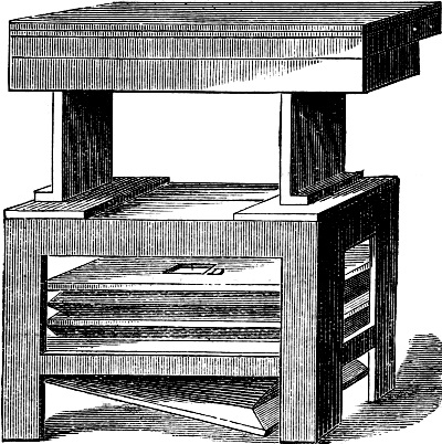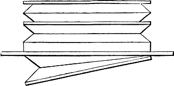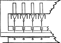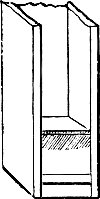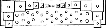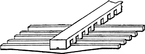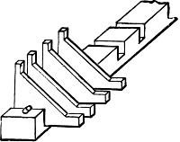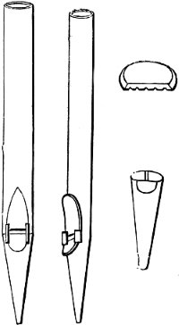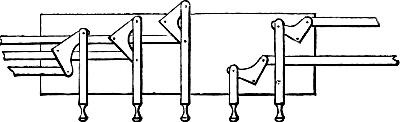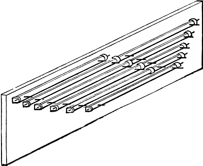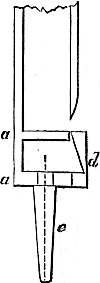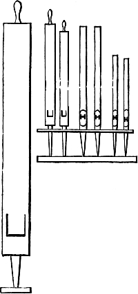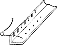 In connection with this it may here be mentioned that most of the holes bored with the brace and bits (though not the huge holes just referred to), will be scorched or charred with a red-hot iron, in order to clear them of splinters, and allow a perfectly free passage for the air which will pass through them. A few pieces of iron rod, of sizes suitable for this purpose, will therefore be required. Many of these holes will be also countersunk, that is, rendered conical at their extremity, in order to receive the conical feet of the pipes which receive from these conduits their supply of wind. This countersunk portion is also scorched or charred, and two or three conical irons will be wanted for this purpose. But we have not yet come to this. When we are ready for these irons, we can have them made by any blacksmith, or we may have put aside some stout morsels of old iron from which we ourselves may contrive to fashion them.