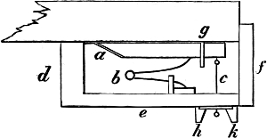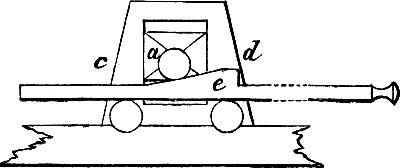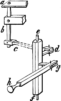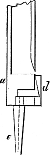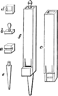 And now we proceed to our work. What we have to do is to make fifty-four pipes, extending from CC to F in alto, and of the form or sort known in England as Stopped Diapason. One of these pipes, let us suppose Tenor C, is shown in Fig. 1. a is a block of mahogany or oak, or of some other wood faced with mahogany or oak, and about 3 inches in length. It has a throat or deep depres[Pg 14]sion across it, formed by taking out the wood between two saw-cuts, or by boring adjacent holes with a centre-bit. b is a stopper, made of any wood, the exact size of the block, or a trifle less, to allow for a leather covering, and fashioned at top into a knob, or turned in the lathe, for convenient handling by the tuner. c is the pipe when put together by gluing three boards, namely, the back and the two sides, to the block, and one, namely the front board, to the edges of the sides. This fourth board is about 3 inches shorter than the others, and has a lip formed on its lower edge by bevelling the wood with a sharp chisel. d is a cap, 3 inches long, and as wide as the block with the side boards attached; it is hollowed in a wedge-shaped form as shown in the figure. e is a foot, turned in the lathe, bored from end to end, and 5 or 6 inches in length. f is the completed pipe, with the stopper inserted, the cap put on, and the foot in its place.