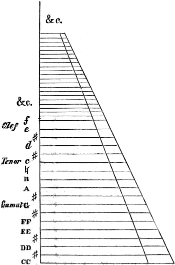 Our explanations will be much assisted here if we introduce a few definitions of terms in constant use. The pipes which we are about to make will give notes, when tuned, which are familiarly designated by certain names. Thus, the lowest[Pg 11] note on the manual or key-board of modern organs is called Double C (printed CC). The note one octave above this is Tenor C; the octave of Tenor C is Middle C; and above this, again, we have Treble C (often called Foot C) and C in Alto. Some of the other notes of the scale, in a similar way, have convenient names. Thus, the first F in the bass is Double F, or FF; the next F, the F of the Tenor octave, is often called Clef F, as the Bass, or F Clef, stands upon this line in music; its sharp is FF sharp; but then we come at once to a single G, and this note is often called Gamut G. The octave above this note is called Fiddle G, as it sounds the same note as the fourth string of the violin. The note B, we may add, throughout the organ, is understood to mean B flat; the semitone above this is indicated by the musical symbol the Natural (♮).