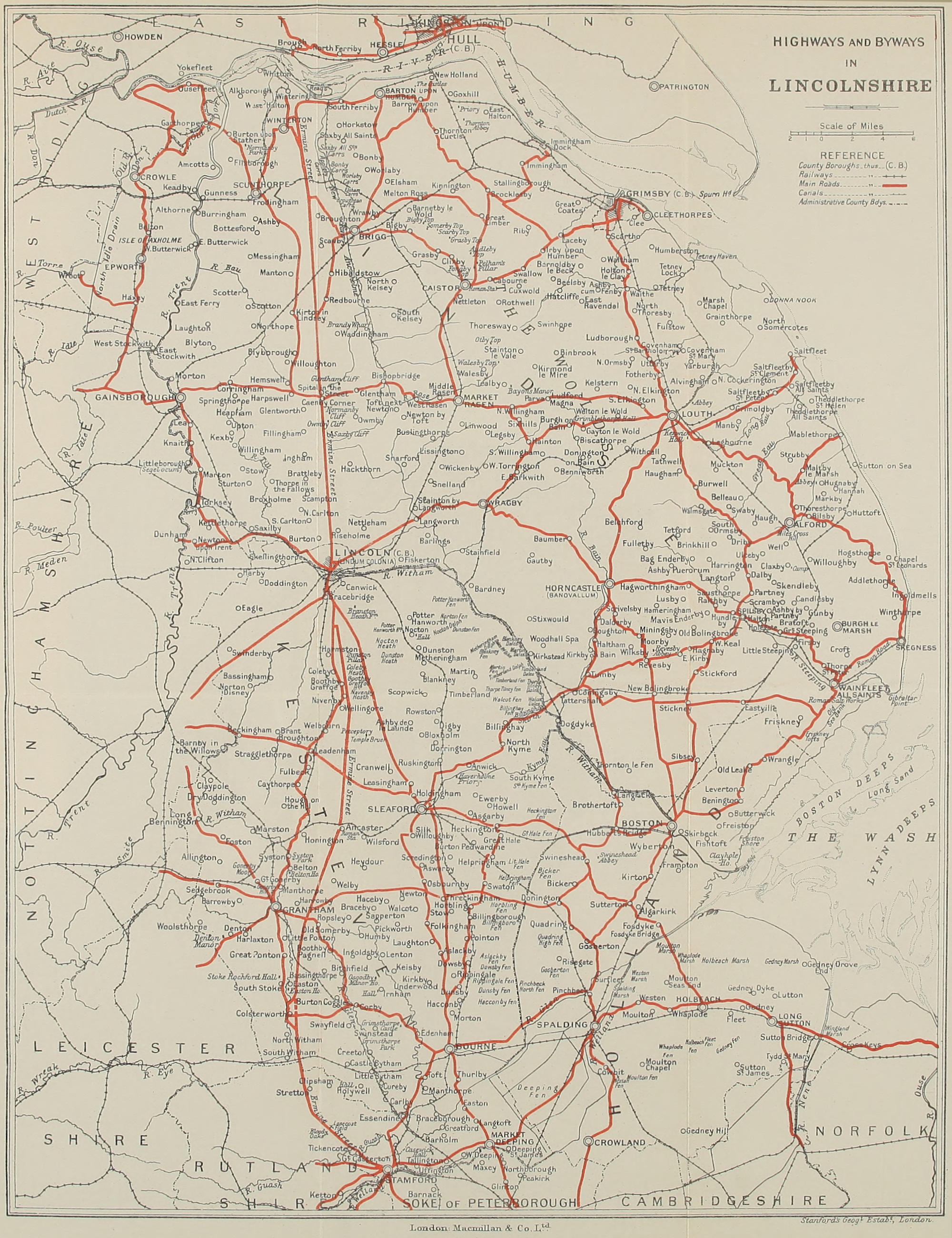 I have perhaps taken the title “Highways and Byways” more literally than has usually been done by writers in this interesting series, and in endeavouring to describe the county and its ways I have followed the course of all the main roads radiating from each large town, noticing most of the places through or near which they pass, and also pointing out some of the more picturesque byways, and describing the lie of the[viii] country. But I have all along supposed the tourist to be travelling by motor, and have accordingly said very little about Footpaths. This in a mountainous country would be entirely wrong, but Lincolnshire as a whole is not a pedestrian’s county. It is, however, a land of constantly occurring magnificent views, a land of hill as well as plain, and, as I hope the book will show, beyond all others a county teeming with splendid churches. I may add that, thanks to that modern devourer of time and space—the ubiquitous motor car—I have been able personally to visit almost everything I have described, a thing which in so large a county would, without such mercurial aid, have involved a much longer time for the doing. Even so, no one can be more conscious than I am that the book falls far short of what, with such a theme, was possible.