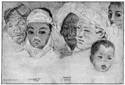 We drop from the comfort of the Cargo Steamer to the comparative discomfort of the train at Rangoon — Another plaguey inspection — Another joyous embarkation on another B.I. Boat — Calcutta — Benares and its Ghats; after the Golden Beauty of Burmah! — Street scenes and riverside horrors — A muddle of indecencies and religions — A superior Fakir's portrait — 333,000,000 gods — An artist's private deductions — Les Indes sans le British — Delhi and Agra. | 380-391 |