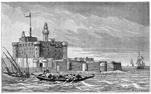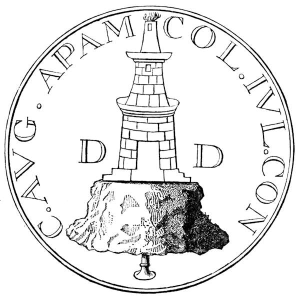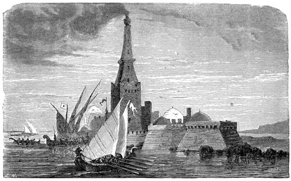The value of this kind of coast defences was so apparent, that the ancients felt unable to ascribe them to simple human invention. And thus the Greeks attributed their origin to the demigod Hercules. But there seems some reason to believe that, long before Greece became a maritime nation, light-towers had been built by the Lybians and the Cuthites along the coast-line of Lower Egypt. These towers, we are told,[1] served as landmarks during the day, as beacons during the night. Their purpose was a holy one, and accordingly they were also used as temples, and each was dedicated to a divinity. The mariner, who naturally held them in great veneration, enriched them with his votive offerings. It has been conjectured by some authorities that their walls at first were painted with charts of the Mediterranean coast and of the navigation of the Nile; these charts being afterwards transferred to papyrus. The priests of these singular but valuable institutions taught the sciences of hydrography and pilotage, and the art of steering a vessel’s course by the aid of the constellations. On the summit of each tower a fire was continually burning; the fire being placed in a machine of iron or bronze, composed of three or four branches, each representing a dolphin or some other marine animal, and all bound together by skilful decorative work. The machine was attached to the extremity of a stout pole, and so placed that its radiance was directed seaward.