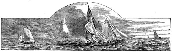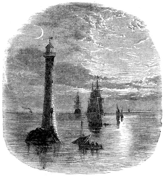 [68] It was this lighthouse, we presume, which underwent so extraordinary an accident on Saturday, February 19th, 1870. About half-past ten A.M., the schooner Elizabeth and Jane, of Preston, approached the mouth of the channel opposite Fleetwood. Adjoining the channel mouth, and about three miles from the latter town, is situated a lighthouse upon screw piles. When about half a mile off the lighthouse, the captain of the schooner found he was drifting towards it, and, spite of all his exertions, he was unable to change her course, as the tide flowed rapidly inwards, and a dead calm prevailed. Before the anchor could get a “hold,” the ship ran bow foremost into the piles, which were all shattered by the collision, and taking up the body of the lighthouse—a huge sexangular timber frame, filled in with windows, and surmounted with “a large revolving (?) light”—carried it away on her forecastle. Two keepers were in the lighthouse, but neither was hurt. The vessel, however, was greatly injured, and some alarm was felt lest she should sink. However the accident was seen from the shore; a tug steamer came to her assistance, and, with the lighthouse on board, she was towed into port. Until a new structure can be raised, a lightship will be stationed in a suitable locality.
