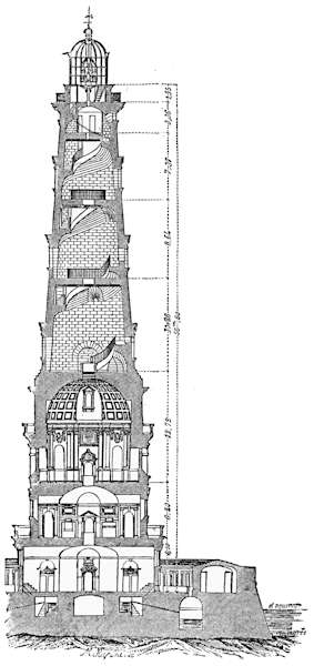 [55] These towers have recently undergone another alteration, and are now lit by the electrical apparatus; giving a light equal to 5000 Carcel burners, and visible for upwards of 27 miles.