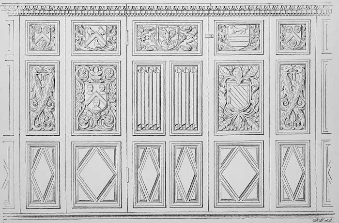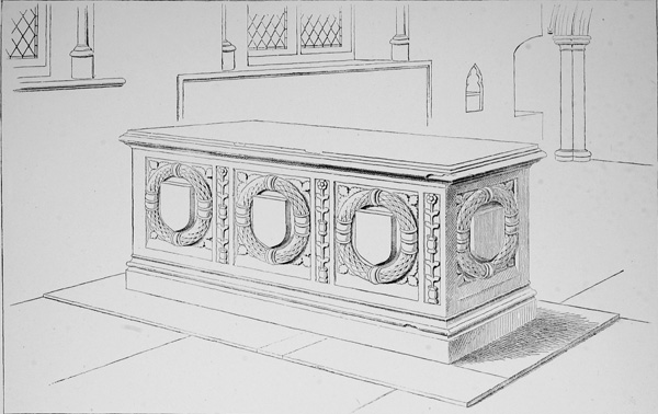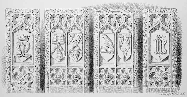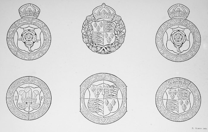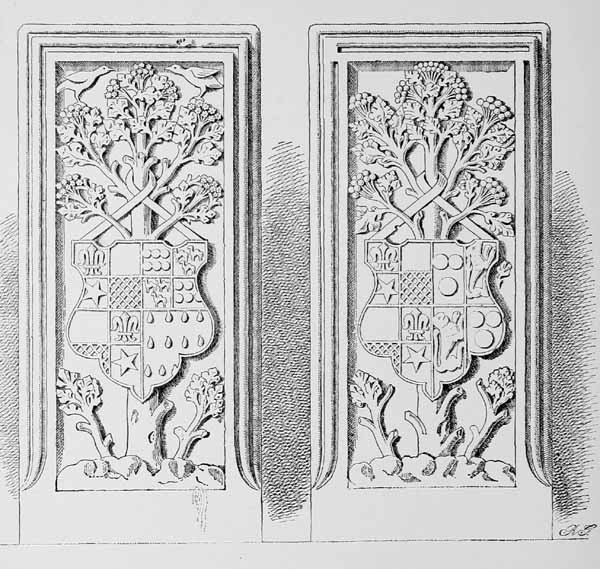 10 Commencing with these, the series of small shields round the tomb, numbering twenty-four in all, follow the same sequence as the corresponding number of quarterings on the escutcheon below them.