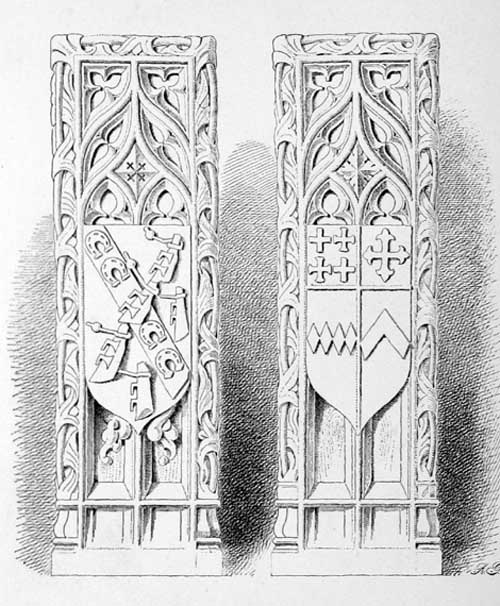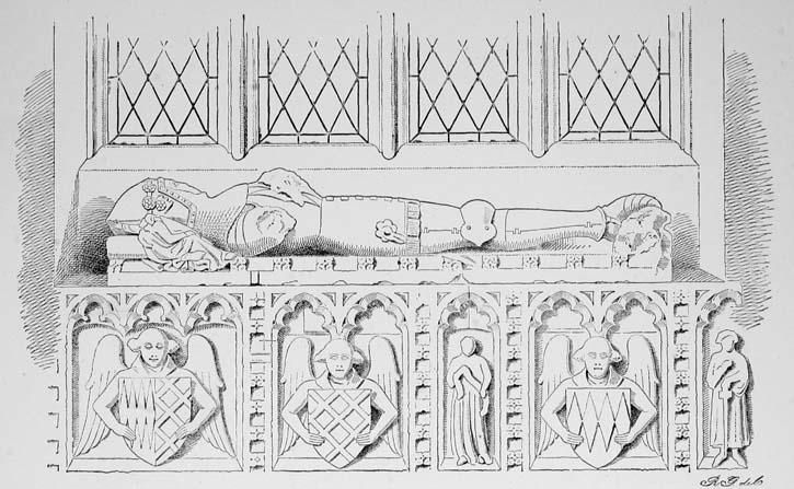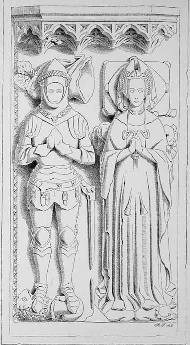 31 Query, if the fine effigies of a knight and lady in Kings-Carswell church in south Devon do not represent this Sir John Dinham and his first wife, Maud Maltravers. The Knight has the arms of Dinham on his surcoat, and the shields on the tomb below display Dinham impaling a fret or fretté. There is another interesting effigy of a lady in the same church, that may possibly be intended for the second wife of Sir John Dinham who was a daughter of John, Lord Lovel.