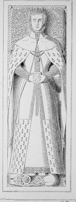 3 The fine and almost perfect memorial brass of this lady is in the chancel of Spilsby church, Lincolnshire. She is habited in cote-hardie with mantle over, crenulated head-dress with coverchief, two dogs with collars and bells at her feet, her head rests on richly embroidered cushions. On the ledger-line is this inscription,