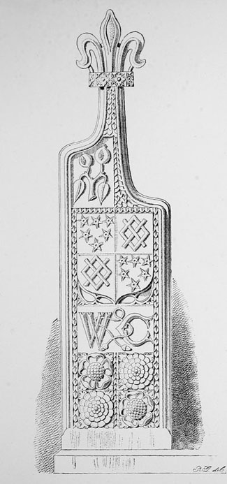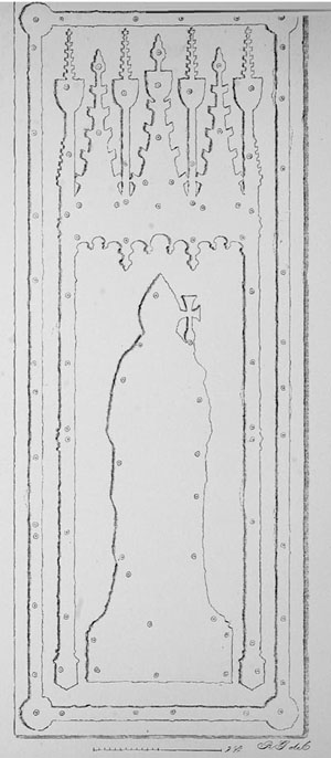 The indent of the brass of Archbishop Stafford being greatly frayed and denuded, the original outlines have been restored in the illustration, after a close and careful examination of the stone itself.