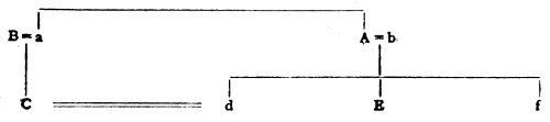 One consequence of the marriage between C and d will be that A, who before the marriage of C was only his mother’s brother, now becomes also his wife’s father, while b, who before the marriage was the mother’s brother’s wife of C, now becomes his wife’s mother. Reciprocally, C, who before his marriage had been the sister’s son of A and the husband’s sister’s son of b, now becomes their son-in-law. Further, E and f, the other children of A and b, who before the marriage had been only the cousins of C, now become his wife’s brother and sister.