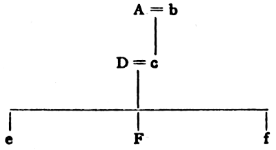This diagram shows that if A marries e, c, who previous to the marriage had been only the daughter of A, now becomes also his wife’s mother; and D, who had previously been his daughter’s husband, now becomes his wife’s father. Similarly, F, who before the new marriage was the[36] daughter’s son of A, now becomes the brother of his wife, while f, his daughter’s daughter, becomes his wife’s sister. Lastly, if we assume that it would be the elder daughters of the daughter who would be married by their grandfathers, e, who before the marriage had been the elder sister of F and f, now comes through her marriage to occupy the position of their mother’s mother.