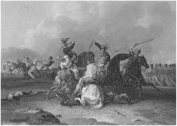 “In many places the dead lay four deep upon each other, marking the spot some British square had occupied, when exposed for hours to the murderous fire of a French battery. Outside, lancer and cuirassier were scattered thickly on the earth. Madly attempting to force the serried bayonets of the British, they had fallen in the bootless essay, by the musketry of the inner files. Farther on, you traced the spot where the cavalry of France and England had encountered. Chasseur and hussar were intermingled; and the heavy Norman horse of the Imperial Guard were interspersed with the grey chargers which had carried Albyn’s chivalry. Here the Highlander and tirailleur lay, side by side together; and the heavy dragoon, with ‘green Erin’s’ badge upon his helmet, was grappling in death with the Polish lancer.”