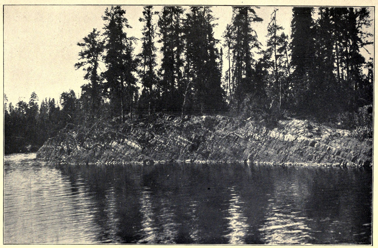 Where terminated by diabase the contact is definite and not marked by notable alteration on either side. Contacts with the Huronian are equally sharp and unconformable, in every case the Laurentian disappearing beneath the sedimentary formation; at the south end of Kenisheong lake the Huronian has been trenched to a depth sufficient to expose the underlying gneissic floor near the water’s edge.