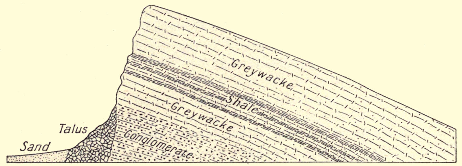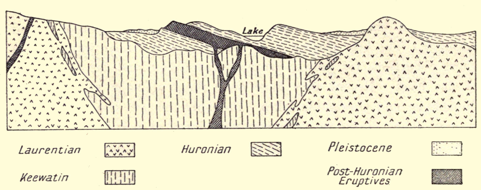 The oldest division, the Keewatin, comprises a complex association of metamorphosed rocks, principally eruptive, characterized by well-developed, secondary schistosity and prevalently dark colours. They dip at angles approaching 90° and range in texture from soft, fissile, chorite schists to fine-grained gneisses or altered diabases. In the Montreal River district the Keewatin areas are not entirely visible, being overlain by other rocks, but they are thought to represent the bottoms of trough-like folds, produced by the upward intrusion of igneous matter which now constitutes the Laurentian. The latter forms the second division, its origin being apparent from the foregoing statement. It is wholly igneous, consisting of granite and allied coarsely crystalline rocks essentially pale-coloured owing to their richness in quartz and feldspars. Gneissic structure has been developed in varying degrees, so that all gradations between granite and gneisses exist; but it never attains the perfection found in the 17Keewatin. Near their contacts with the Keewatin, the gneisses are apt to contain dark bands and ribbons of the latter so highly crystalline as to conceal their identity.
