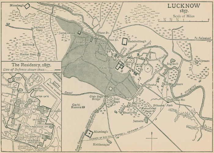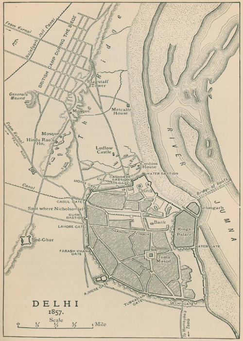 The outbreak was thus, at the beginning, a purely military mutiny; but its complexion and character[11] later on were affected by local circumstances. In Oude, for example, the Mutiny was welcomed, as it seemed to offer those dispossessed by the recent annexation, a chance of revenge. At Delhi it found a centre in the old king’s palace, an inspiration in Mohammedan fanaticism, and a nominal leader in the representative of the old Mogul dynasty. So the Mutiny grew into a new struggle for empire on the part of some of the Mohammedan princes.