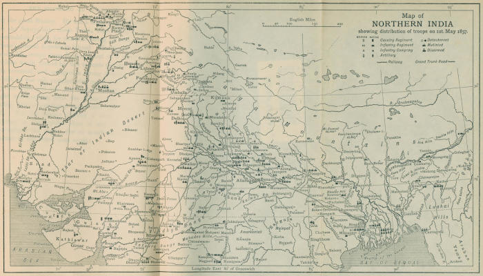 The distribution of the British forces in Bengal, in 1857, it may be noted, made mutiny easy and safe. We have learned the lesson of the Mutiny to-day, and there are now 74,000 British troops, with 88 batteries of British artillery, in India, while the Sepoy regiments number only 150,000, with 13 batteries of artillery. But in 1857, the British garrison had sunk to 38,000, while the Sepoys numbered 200,000. Most of the artillery was in native hands. In Bengal itself, it might almost be said, there were no British troops, the bulk of them being garrisoned on the Afghan or Pegu frontiers. A map showing the distribution of troops on May 1, 1857—Sepoys in[20] black dots, and British in red—is a thing to meditate over. Such a map is pustuled with black dots, an inky way stretching from Cabul to Calcutta; while the red points gleam faintly, and at far-stretched intervals.