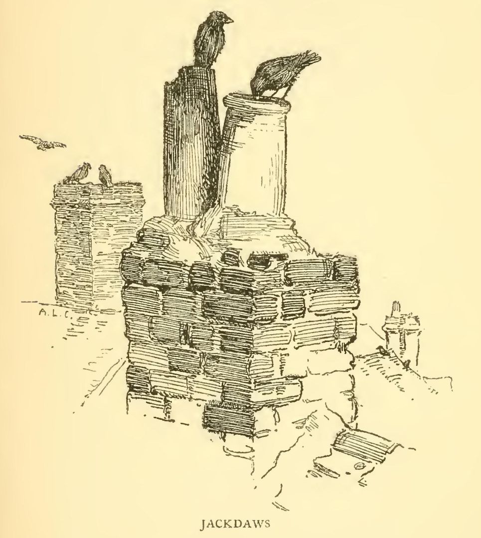 The following winter (1906-7) I found a lodging in another part of the town, in a terrace rather high up, where I could look from my window at the Bay over the tiled roofs of the old town. Here I had a front garden to feed the birds in, and, better still, the entire jackdaw population of St. Ives, living on the roofs as is their custom, were under my eyes and could be observed very comfortably. I discovered that they filled up a good deal of their vacant time each morning in visiting the chimneys from which smoke issued, just to inform themselves, as it seemed, what was being cooked for breakfast. This was their pastime and watching them was mine. Numbers of daws would be seen, singly, in pairs, and in groups of three or four to half a dozen, sitting on the roofs all over the place. As the morning progressed and more and more chimneys sent out smoke, they would become active visiting the chimneys, where, perching on the rims, they would put their heads down to get the smell rising from the pot or frying-pan on the fire below. If a bird remained long perched on a chimney-pot, his neighbours would quickly conclude that he had come upon a particularly interesting smell and rush off to share it with him. When the birds were too many there would be a struggle for places, and occasionally it happened that a puff of dense black smoke would drive them all off together.