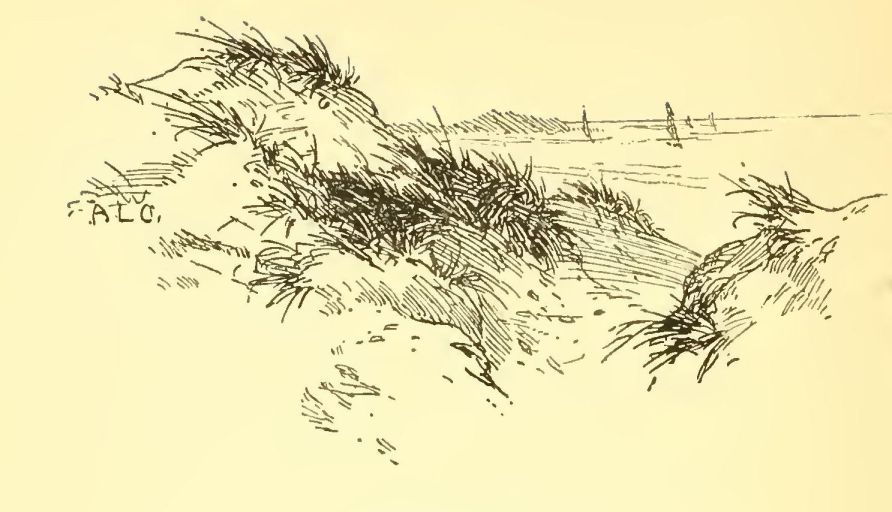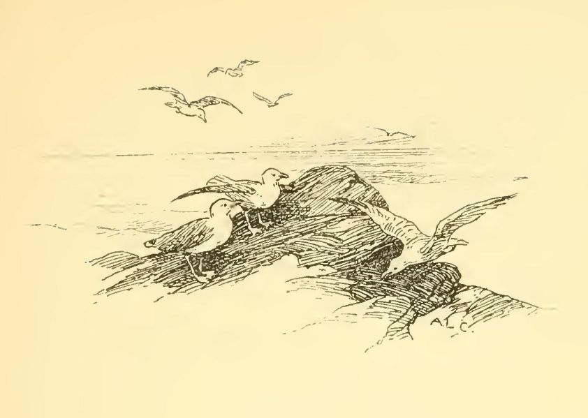 One day I caught sight of a large ivory-white gull of an unknown species sitting on the water some distance from the shore, and was very anxious to see more of this bird. Two or three days later I was with an artist friend in his studio, and was standing at the window which looks upon a sandy cove at the back of the town. By and by a wave of the incoming tide threw up a dead dogfish about three feet long on the white sand within fifty yards of the window. Scarcely was the fish left by the retiring water before a big white-winged gull dropped down upon it—the very bird I had been hoping to encounter again! There it remained, trying to tear a hole in the tough skin, fully five minutes before the returning water took the fish away, so that I had a good chance of examining it through a binocular. It was considerably bigger than the herring gull, with a much more formidable beak and altogether a bolder appearance, and the entire plumage was of a chalky white. It was a Glaucous gull—the famous Burgomaster of the Arctic Sea, probably a female in immature plumage. In a few moments other gulls dropped down to get a bite—three herring and one black-backed gull with some smaller gulls—but they were not allowed to taste the fish. When one attempted to come near it the white gull looked fixedly at him a couple of moments, then drawing in its head suddenly tipped its beak upwards—an expressive gull gesture corresponding to the snarl of a dog when he is feeding and other dogs approach him. It produced a marked effect on the other gulls; perhaps the Burgomaster, a rare visitor to our seas, was known, from hearsay, to them as a great tyrant.