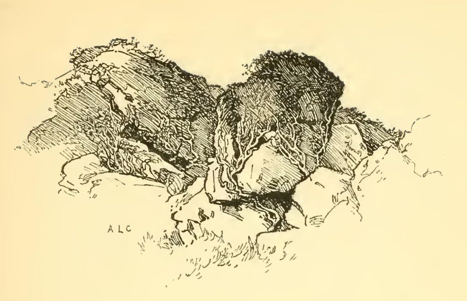 is how Gordon Hake describes the appearance, seeing, as I do, the desire and struggle to escape—to fly from that pitiless persecution. But the "wings" I do not see: in summer the foliage is to my sight but a ragged mantle; in winter the human expression is strongest and most pathetic. Held by the feet in the grip of earth, the beaten bush strains to get away; it suggests the figure of a person crawling, or trying to crawl, the knee-like joints on the ground, the body-like trunk thrown forward, the long bare branches and terminal twigs, like the brown, thin naked arms and claw-like opened fingers of a starving scourged slave in the tropics, extended imploringly towards the land.