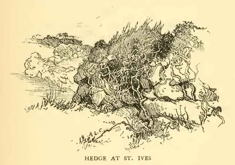 In West Cornwall, where I first came to know the native hedge, they cannot have these belts of thicket, rich in a varied plant and animal life. It is a country of moors and rugged stony hills where nothing flourishes but heath and furze and bracken. The farming folk have succeeded in long time in creating small arable and grass fields in the midst of this desolation, but they cannot grow trees on account of the violent winds charged with salt moisture that blow incessantly from the Atlantic. If the farmer plants a few trees so that he may one day eat an apple of his own growing and sit in the shade, he must build a wall eight or ten feet high to protect them from the salt blast, and he may then die of old age before the apple is ripe or the shade created. Nor can he grow a hedge: the furze, it is true, abounds everywhere, but it is a most intractable plant that will go (or grow) its own wild way, and no man has yet subdued it to his will and made it serve as a hedge. Yet even in this wind-vexed land a few self-planted trees may be seen.