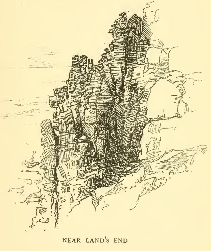 But books, however eloquent and heart-searching they may be, cannot produce an effect comparable to that of seeing and hearing—to the sight and sound of emotion in men's faces and voices and in their words. The passage I have quoted, and all the other passages on the subject in the other books I had read, gave me no such vivid idea of the strength of the sentiment we are considering as did the other incident I wish to relate when, on May 24, at Penzance station, I witnessed the arrival, in four trains, of about twelve hundred trippers from some of the cotton-spinning centres forty or fifty miles north of Manchester. The first train steamed into the station, where a crowd had gathered to see the horde of strange people from the north, at 10.45 the last of the four arrived a little before 12 at noon. The return journey would begin at 6.30 on the same day: the entire distance to and from Penzance was considerably over eight hundred miles; the time it took, twenty-six to twenty-eight hours, and the time the travellers had at their disposal at their destination was about seven hours. I was amazed that twelve hundred men had been found to undertake such a journey just to see Penzance—one of the least interesting towns in the kingdom; but when I mixed with and talked with them on their arrival, they assured me they had not come for such an object and would be content to go back without seeing Penzance. Nor did they come for the sake of anything in fine scenery which Cornwall could show them; North Wales with its bold sea-coast and magnificent mountain scenery was easily accessible to them. What they came to see was the Land's End.