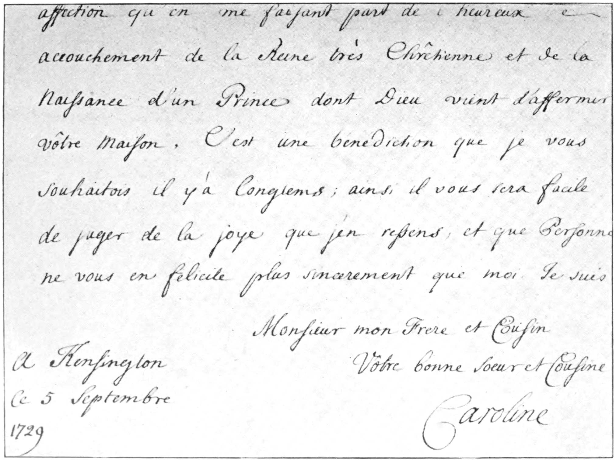 The Queen’s influence was now beginning to tell. At first she persuaded the King to delay, for she knew that if he delayed he would reflect, and if he reflected he would change his mind. She reminded him of the trouble a change of Ministers would involve before he was comfortably seated on the throne, and she knew the King hated trouble. The King objected to Walpole’s notorious greed for gold, but the Queen met this by saying that, with so many opportunities of amassing wealth, he must by this time have become so rich that he would want no more, and this, in a lesser degree, applied to his colleagues. “The old leeches,” she cynically added, “will not be so hungry as the new ones, and will know their business much better.” The critical situation of foreign affairs was another of the arguments used by the Queen in favour of Walpole, for no one had the same grasp of the tangled skeins of foreign policy as he. The European courts, which did not understand the working of the English Constitution, might become alarmed at a sudden change of Ministry and imagine that it foretold a change in England’s foreign policy, thus creating a general distrust, which would be dangerous to the reigning dynasty, more especially as there was always the fear of secret negotiations going on between James and the Roman Catholic courts of Europe. This was13 particularly true of France, with whom it was of the utmost importance to maintain good relations at the present juncture. Whilst Caroline was thus arguing, as luck would have it, Horace Walpole, the Prime Minister’s brother, who was ambassador to France, arrived in England with a letter which his diplomacy had obtained from Cardinal de Fleury, pledging his master to maintain the treaties France had entered into with the late King, and to show goodwill towards George and ill-will to James. All these considerations told. But the most cogent argument which the Queen urged, and the one which had undoubtedly the most weight with the King, was the settlement of the Civil List. The new Civil List, Caroline reminded the King, was pressing, but a change of Ministers was not. There was nobody so able as Walpole to secure for them a handsome increase of the Civil List, for, as the old King said, he “could turn stones into gold”. Why then let private resentment lead to personal inconvenience?