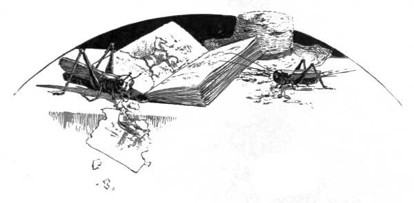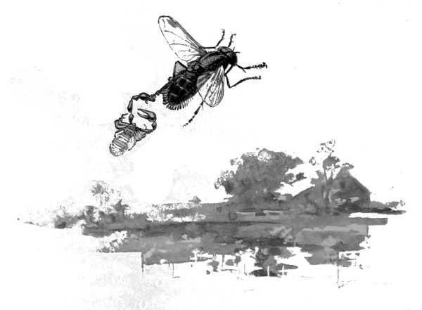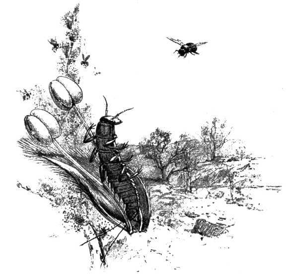 "Do you wonder that I am as blue as indigo, and am occasionally forced to resort to my oil-tank to still the troubled waters of my later experience? Well, as I was saying (pardon this fresh display of tears), when I crept out of that filmy egg-sac I was just ready for anything, and spoiling for adventure. I found myself with a slender, agile body of thirteen joints, and three pairs of the sprightliest, spider-like legs you ever saw, each tipped with three little sharp claws. Now I knew that these long legs and claws were not given to me at this early babyhood for nothing, so I looked about for something to try them on. I had not a great while to wait, for as I crept along through the grass roots beneath the edge of the stone, I heard a welcome sound, which is music to all babies of my kind. I remembered having heard the same music in my dreams while inside the little yellow case, but now it seemed louder than ever, and in another minute I was almost blown off my feet by the breeze which the noise made, and a great black, hairy giant, as big as a house, pounced down just outside the stone. He had a great black head, and six enormous legs as big round as trees. Think how a bumblebee would look to a wee baby not half as big as a[6] hyphen in one of your books! Did I run when I saw him coming? Not a bit of it. I just waited until he came close to me, and then I jumped on his back, and put those eighteen little claws of mine to good use as I crept over his great spiny body, and finally found a snug resting-place beneath it. And then I waited, clinging tightly with my clutching feet. In another moment I had begun to take my first outing; and did ever baby have such a ride, and to such music! After the bumblebee had remained under the stone a little while he turned and went[7] out again. No sooner did he get to the edge than he spread his great buzzing wings, and away we went over the world, higher and higher, miles high, over big oceans and mountains. I could see them all beneath me as I clung to the underside of the bee. I believe I must finally have got dizzy and faint, for I remember at last finding myself at rest in a queer thicket of greenish poles with big yellow balls at the top of them, and great giant leaves fringed with long, glistening hairs. They told me afterwards it was a willow blossom.