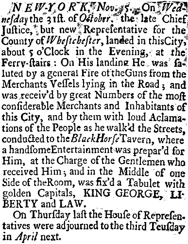 NEW-YORK, Nov. 5. On Wednesday the 31st of October, the late Chief Justice, but new Representative for the County of Westchester, landed in this City, about 5 o’Clock in the Evening, at the Ferry-stairs: On His landing He was saluted by a general Fire of the Guns from the Merchants Vessels lying in the Road; and was receiv’d by great Numbers of the most considerable Merchants and Inhabitants of this City, and by them with loud Aclamations of the People as he walk’d the Streets, conducted to the Black Horse Tavern, where a handsome Entertainment was prepar’d for Him, at the Charge of the Gentlemen who received Him; and in the Middle of one Side of the Room, was fix’d a Tabulet with golden Capitals, KING GEORGE, LIBERTY and LAW.