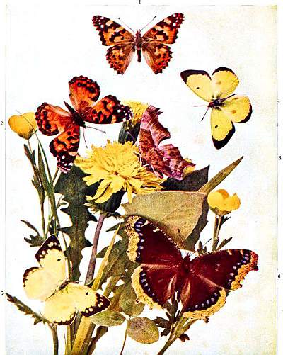 Sign); 4. Colias Philodice, Godt., ♂; 5. Do., ♁ (The Clouded Sulphur); 6. Vanessa Antiopa, Linn., ♁ (The Mourning Cloak).
