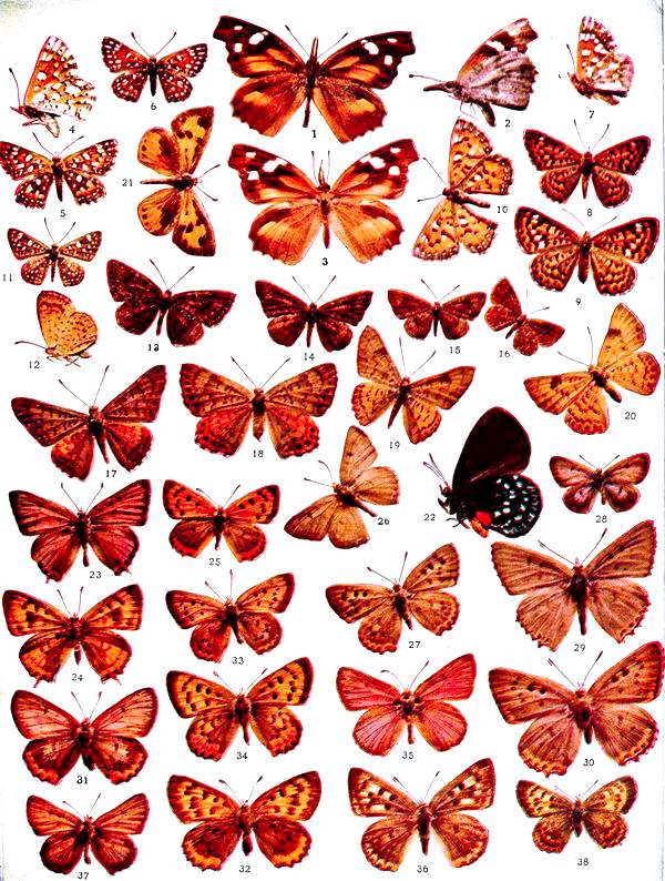 | 18. Hylephila phylæus, Drury, ♂. | 38. Phycanassa howardi, Skinner, ♂. |