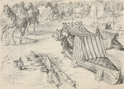 Tom jumped into the water, and had little trouble in climbing into Harry’s canoe—the water being perfectly quiet. The fleet then paddled back to the sand-spit, where they landed and breakfasted, while Tom dried his clothes by the fire.