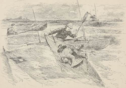 “She’s half full of water, that’s all,” replied Charley, beginning to bail vigorously with his hat.