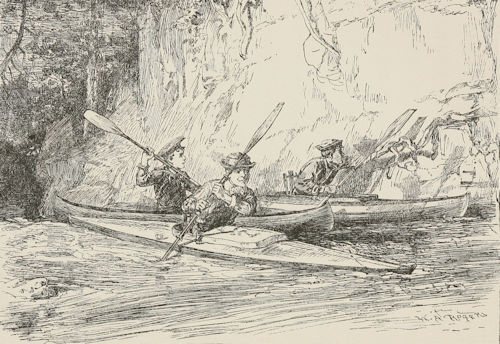 The fourth canoeist was, on the whole, the most courteous and amiable of the four. He begged his young friends to pay no attention to those who recommended wooden canoes, no matter what model they might be. “Canvas,” said he, “is the only thing that a canoe should be built of. It is light and strong, and if you knock a hole in it you can mend it in five minutes. If you want to spend a great deal of money and own a yacht that is too small to sail in with comfort and too clumsy to be paddled,[17] buy a wooden canoe; but if you really want to cruise, you will, of course, get canvas canoes.”