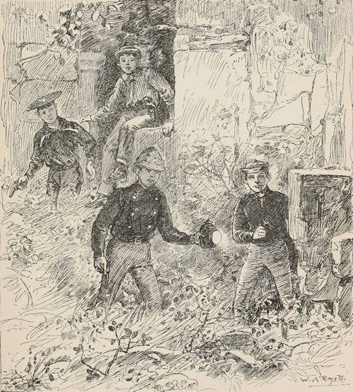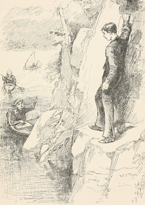 They were again unsuccessful. While Joe sailed up and down along the shore, the two other boys paddled close to the rocks, and searched every foot of space where it would have been possible for a canoe to land, or a canoeist to keep a footing above the water. They had searched the shore for a full mile above the sand-spit and had paddled back nearly half the way, when they were suddenly hailed, and looking up, saw Tom standing on a ledge of rock ten feet above the water.