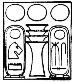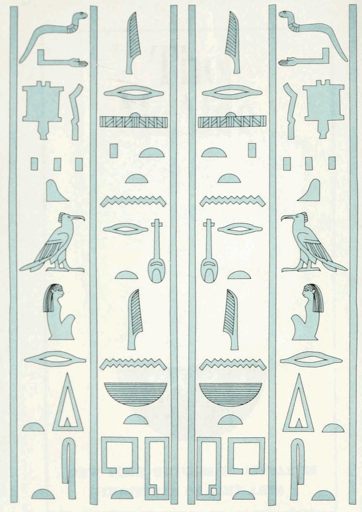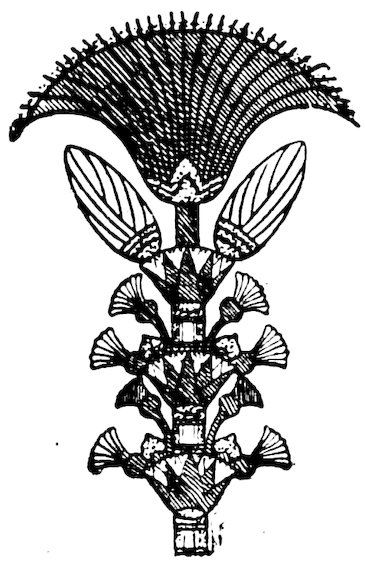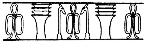 But the hieroglyphs were not only a writing, they were a decoration in themselves. Their position was ruled by their effect as a frieze, like the beautiful tile borders of Cufic inscription on Arab architecture; and we never see in Egypt the barbarous cutting of an inscription across figure sculptures as is so common in Assyria. The arrangement of the groups of hieroglyphs was also ruled by their decorative effect. Signs were often transposed in order to group them more harmoniously together in a graceful scheme; and many sounds had two different signs, one tall, another wide, which could be used indifferently (at least in later times) so as to combine better with the forms which adjoined them. In short, the 4Egyptian with true decorative instinct clung to his pictorial writing, modified it to adapt it to his designs, and was rewarded by having the most beautiful writing that ever existed, and one which excited and gave scope to his artistic tastes on every monument. This is but one illustration of the inherent power for design and decoration which made the Egyptian the father of the world’s ornament.