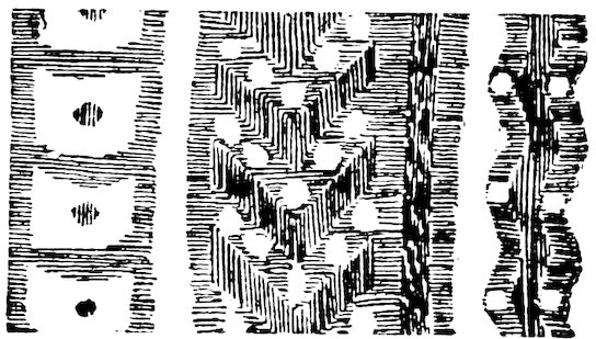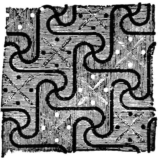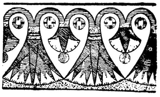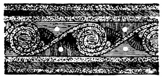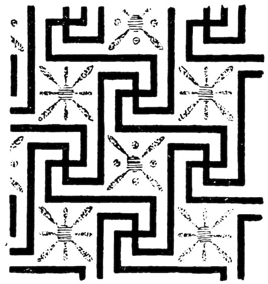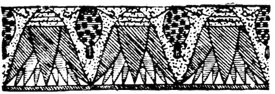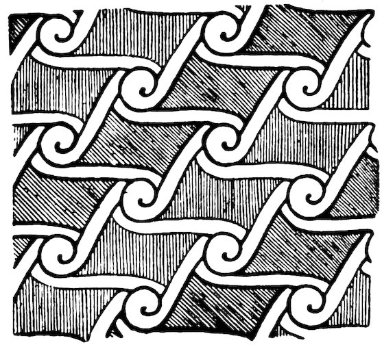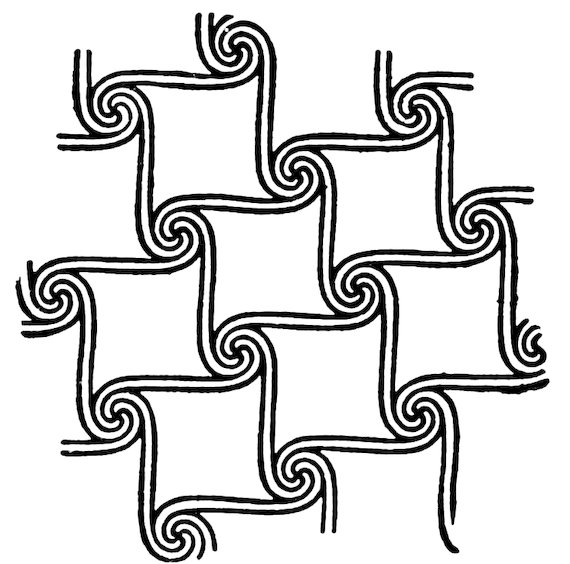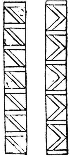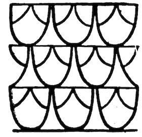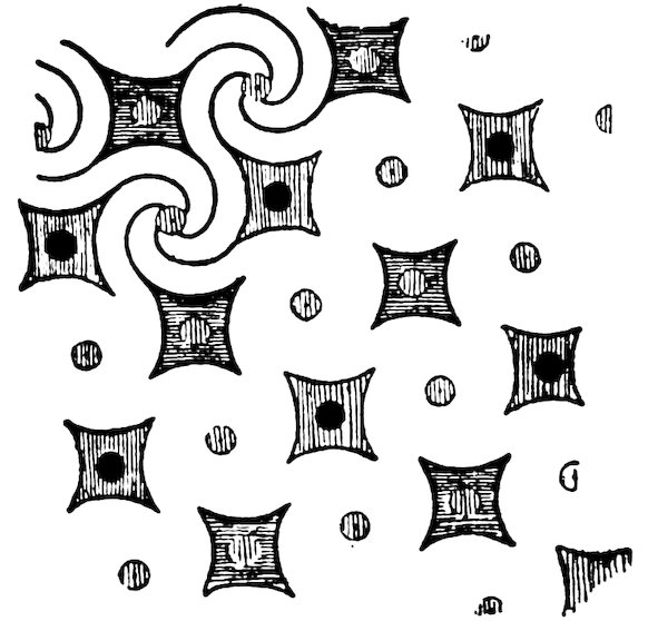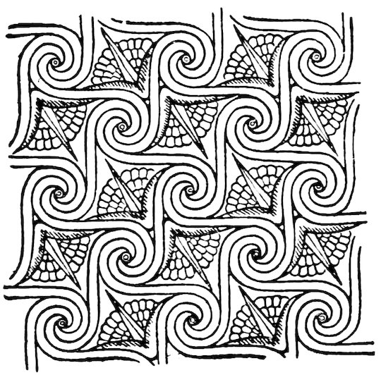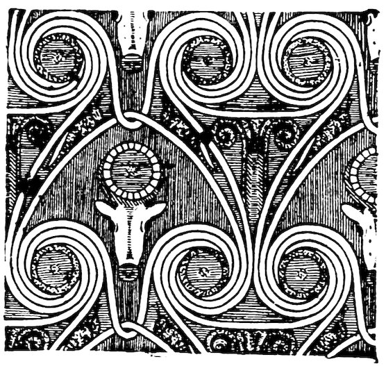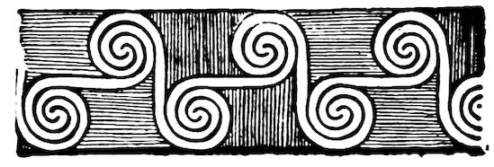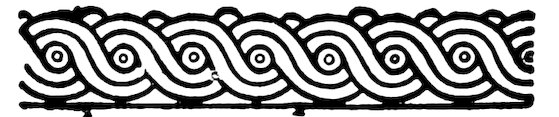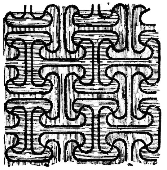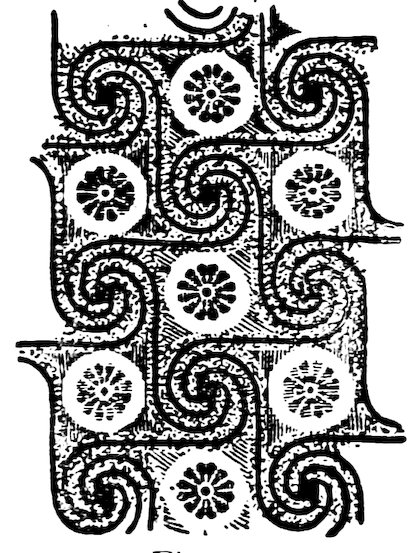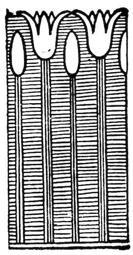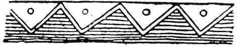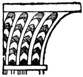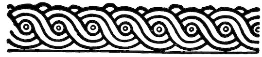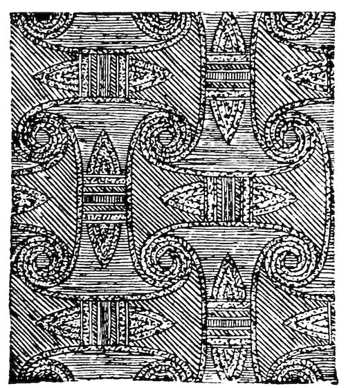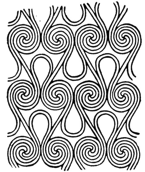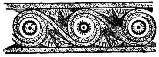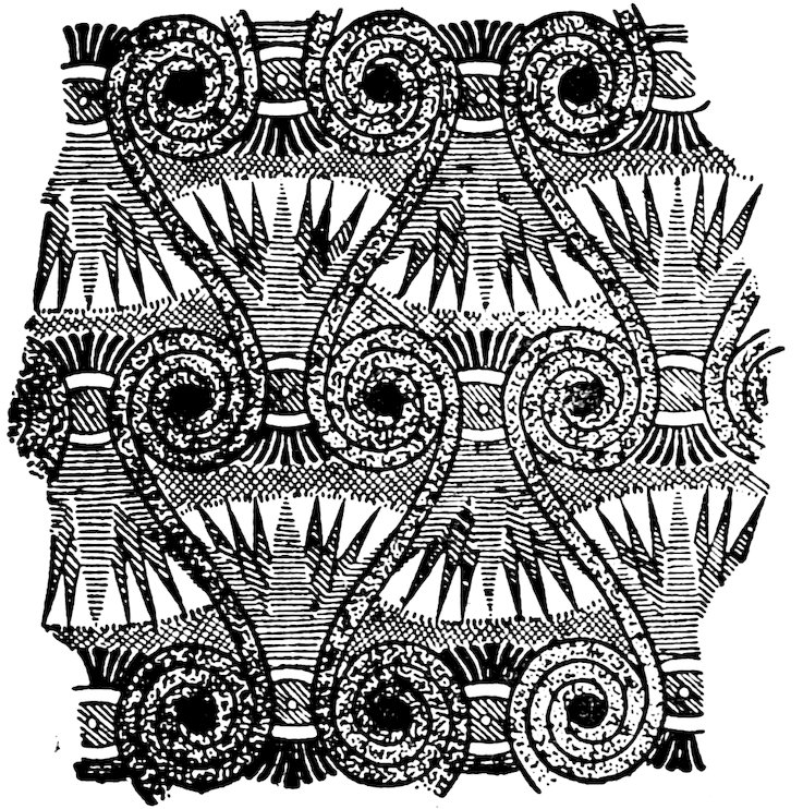 As our object is the history and evolution of the various elements of decoration, we may classify these elements under four divisions. There is the simplest geometrical ornament of lines and spirals and curves, and 10of surfaces divided by these into squares and circles. There is the natural ornament of copying feathers, flowers, plants, and animals. There is structural ornament which results from the structural necessities of building and of manufacture: these often result in the perpetuation of defects or copies of defects, like the circle stamped in the plain end of meat tins which is made to imitate the circular patch soldered on to the other end, so trying to establish a balance of appearance. Many architectural devices and difficulties are perpetuated for us in this way long after the original purpose has passed away; such as the cylindrical bosses projecting from the walls in Moslem architecture, which imitate the projecting ends of pillars torn from ruins and built into the wall, though rather too long for the position. The origin and the imitation can be seen side by side at Jerusalem. Structural ornament is therefore 11often of the greatest historical value as pointing to a condition of things that has since vanished.