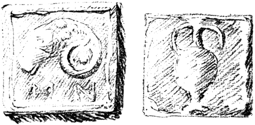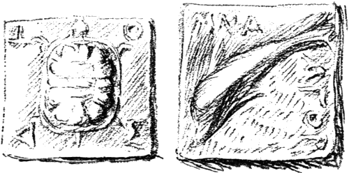 The market weights are remarkable in bearing devices like the types of coins. For the most part they are square cakes and the devices simple almost to rudeness, yet they have that impress of style and grace in the design, with the large free handling in which is the exquisiteness of Greek art. A sketchiness so simple and easy can be the only right treatment for a metal so likely to receive injury in the use; to these as in all art so considered the inevitable injuries of wear are little loss. We can hardly suppose that such a simple industry as making lead weights for the markets would have had artists capable of designing, and suggesting in relief types like these, rather we may suppose that some of the great coiners furnished the models, especially as they would be issued by the authorities of the several towns.