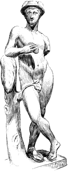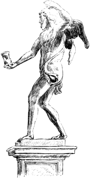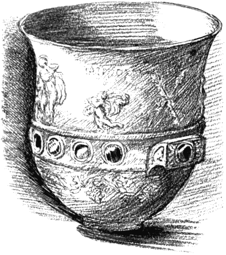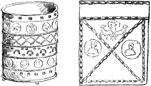 A beautiful object, remarkable as an instance of lead used in an article of price, is a vase some 5 inches high. This is evidently a wine cup from the figures and emblems which decorate it—Bacchus, Silenus, thyrsi bound with cords, and four genii of the Seasons carrying appropriate symbols, one being a garland, another a sheaf of corn; around the middle is a belt set with glass jewels of varied colour, dull reds, greens, and blue, and below this is a wreath of vine (Fig. 10).