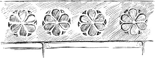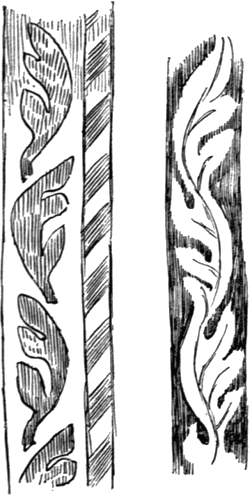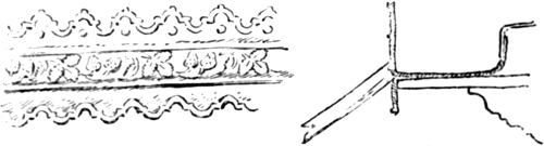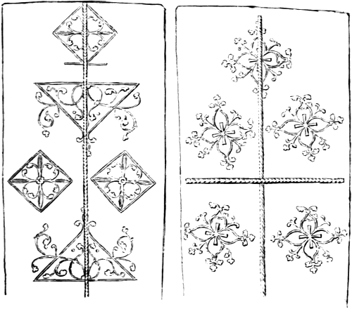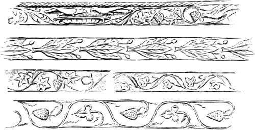 We may take this first opportunity of remarking that the patterns for all ornament intended for casting should be modelled like these, never carved, as is now so universally the case for cast iron and the applied enrichments of picture frames, the reason being that cast material of this sort, so easily injured, is unsuited for giving definition and high relief, and should accept all the limitations of material frankly and make the most of dull suggestiveness; for in all these the “best are but shadows” the modelling emerging from or melting away in the ground. In two attempts the present writer has made in modelling for lead casting wax was used in one instance, and in the other, where very delicate relief was required made up mostly of threads and dots, gesso was found to answer.