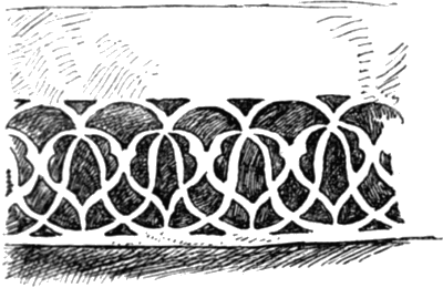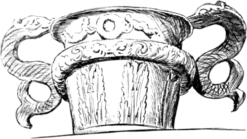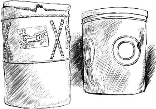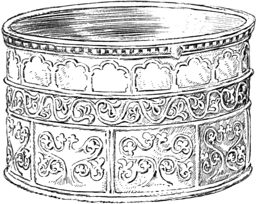 There are many beautiful cistae or circular boxes in the museums of Naples and Rome. These are decorated with little medallions, shells, beaded rods, &c., stock patterns which were impressed in the sand mould in such fresh[13] combinations as the thought of the workmen suggested, just as a cook makes pie crust, which is the subject of nearly the only spontaneous decorative art now remaining to us. Figs. 8 and 9 are from the Kircherian Museum.