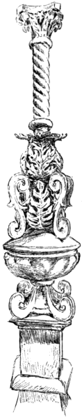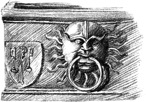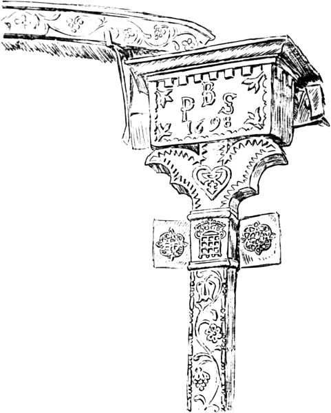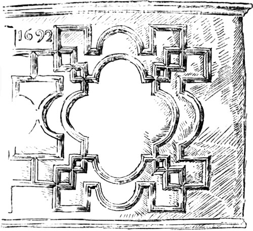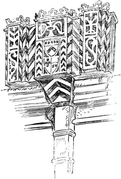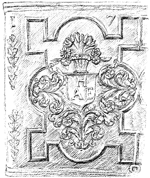 In that most splendid work of the English renaissance, the palace of Nonsuch, which was begun by Henry VIII. in 1538, the structure was what we call half-timber, the panels were filled with coloured and gilt reliefs by Italian modellers, and the timber framing is described by Pepys, who visited it in 1665, as sheeted with lead. This casing we may be sure was covered with delicate Italian arabesques. His words are, “One great thing is that most of the house is covered, I mean the posts and quarters in the walls, with lead and gilded.”